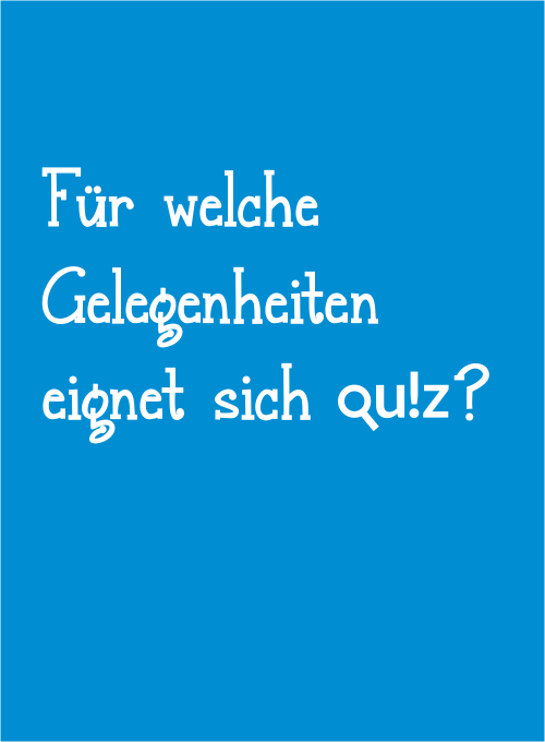 Quiz eignet sich als Team-Event für verschiedene Gelegenheiten: ob als Firmenevent für Weihnachts- oder Sommerfeiern, oder als Privatevent für Hochzeiten oder Geburtstagsfeiern. Wann immer ein Rahmenprogramm für ein Fest gewünscht ist, eignet sich ein Quiz um Spielspaß unter den Gästen zu verbreiten.